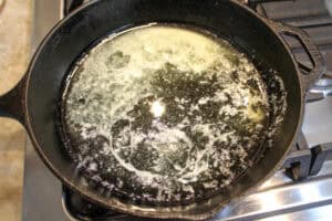 Preheat oven to 350 degrees and melt the butter in your skillet or dish .